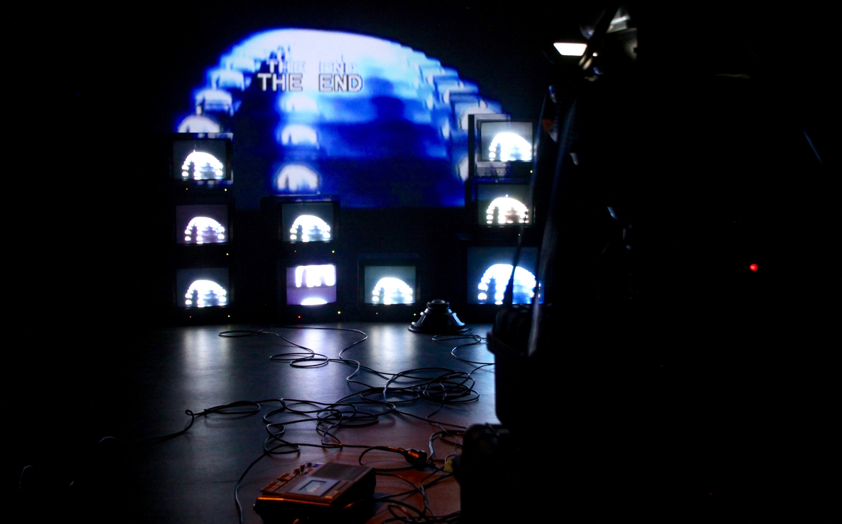 CRT monitors, projector, video camera, speakers, tape recorders, looping cassettes containing sonic content, amplifiers, electronics, adhesive tape, equipment cases.